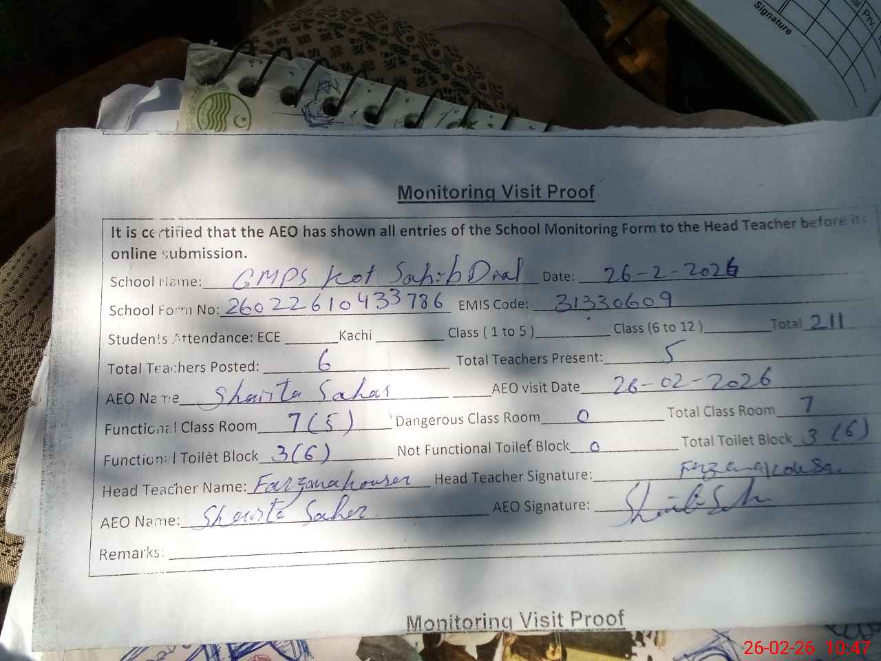 | EMIS Code: 31330609 | Name of School: GMPS KOT SAHIB DIYAL | |||