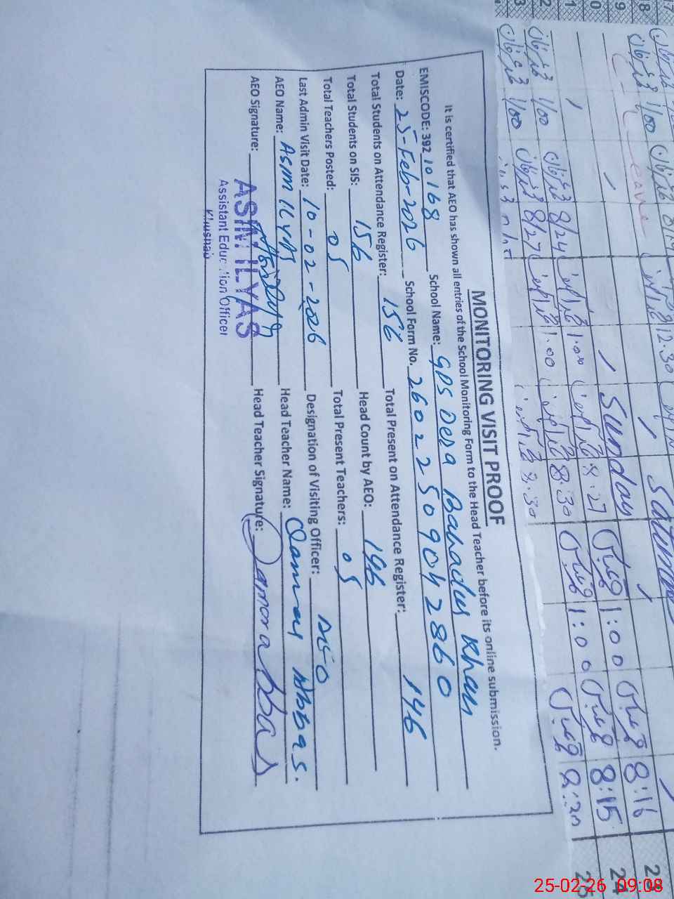 | Certified that this School was Inspected by the Undersigned MEA/DMO Today and the Information Stated Above is as Per Record. | |||||
