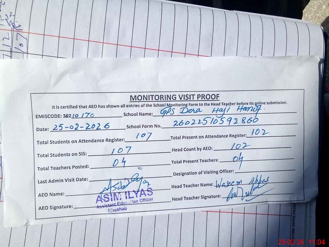 | Attendance Register | Head Teacher | MEA with School | Visit Proof |