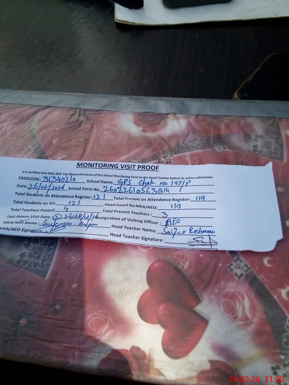 | Attendance Register | Head Teacher | MEA with School | Visit Proof |