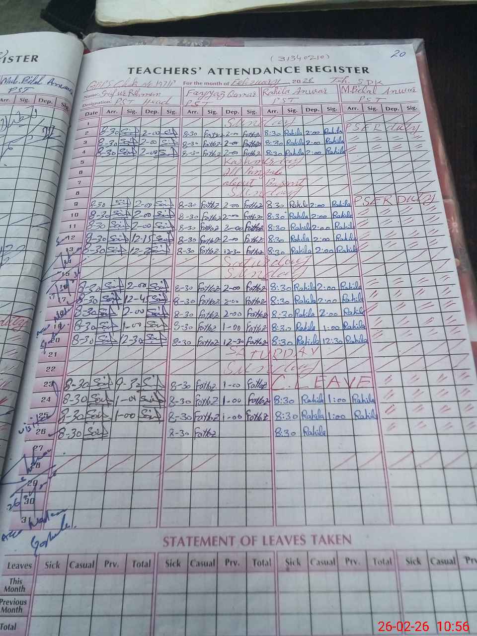 | CNIC | Full Name | Designation | R/C | Absence During Last Calender Month |