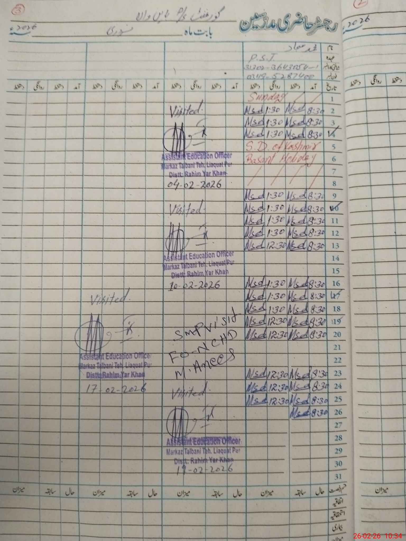 | Name: M.AF**** Designation: (School Headmaster's/Headmistress's) PST/PTC/JV Phone/Cell Number: 03**** |