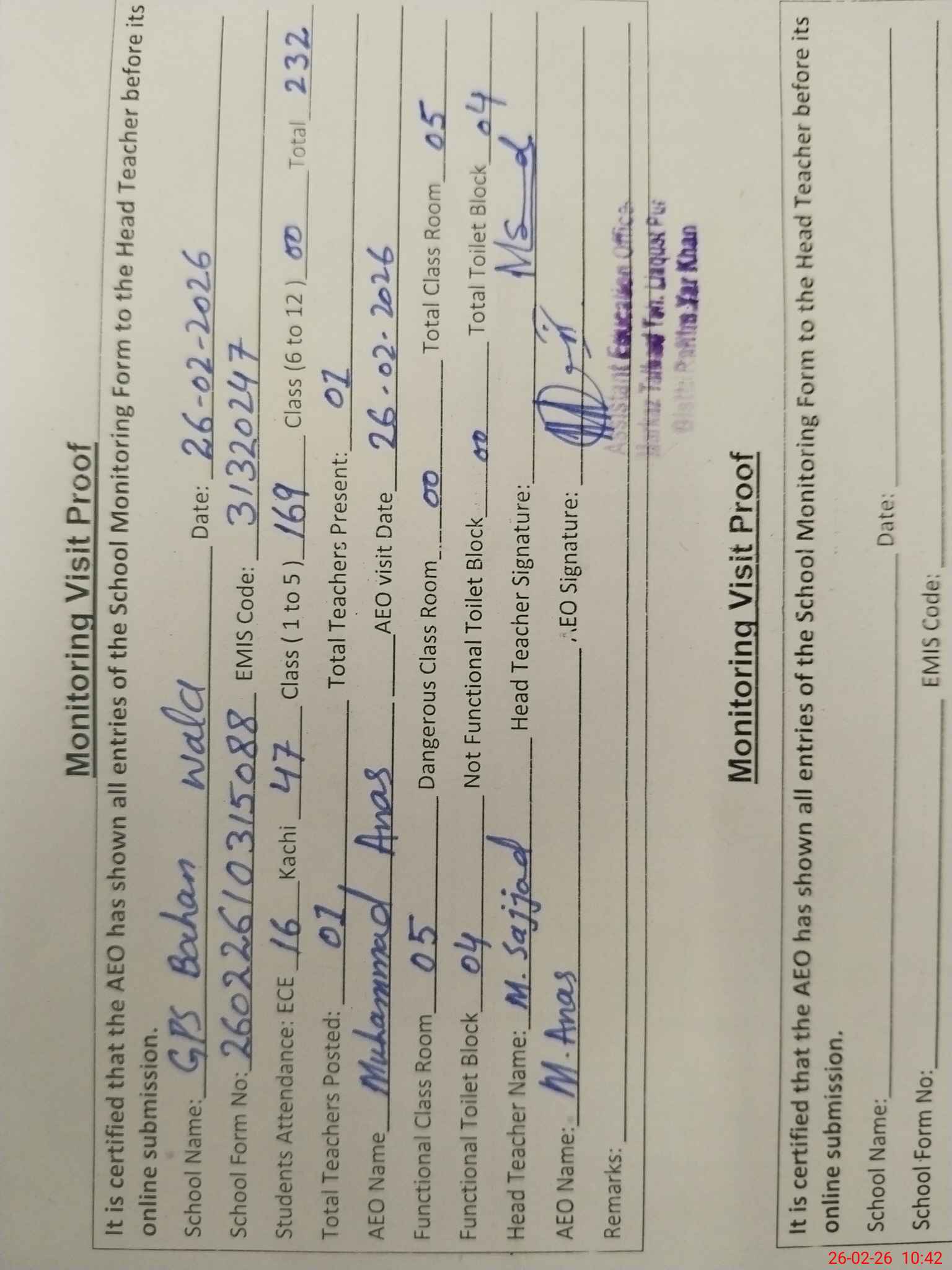 | EMIS Code: 31320247 | Name of School: GPS BAHAN WALA | |||