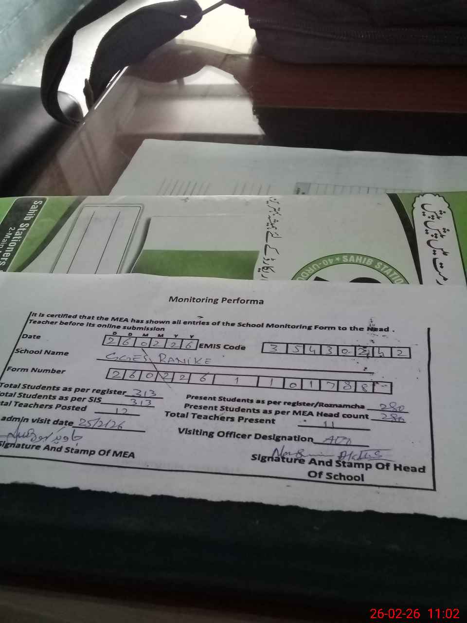 | Attendance Register | Head Teacher | MEA with School | Visit Proof |