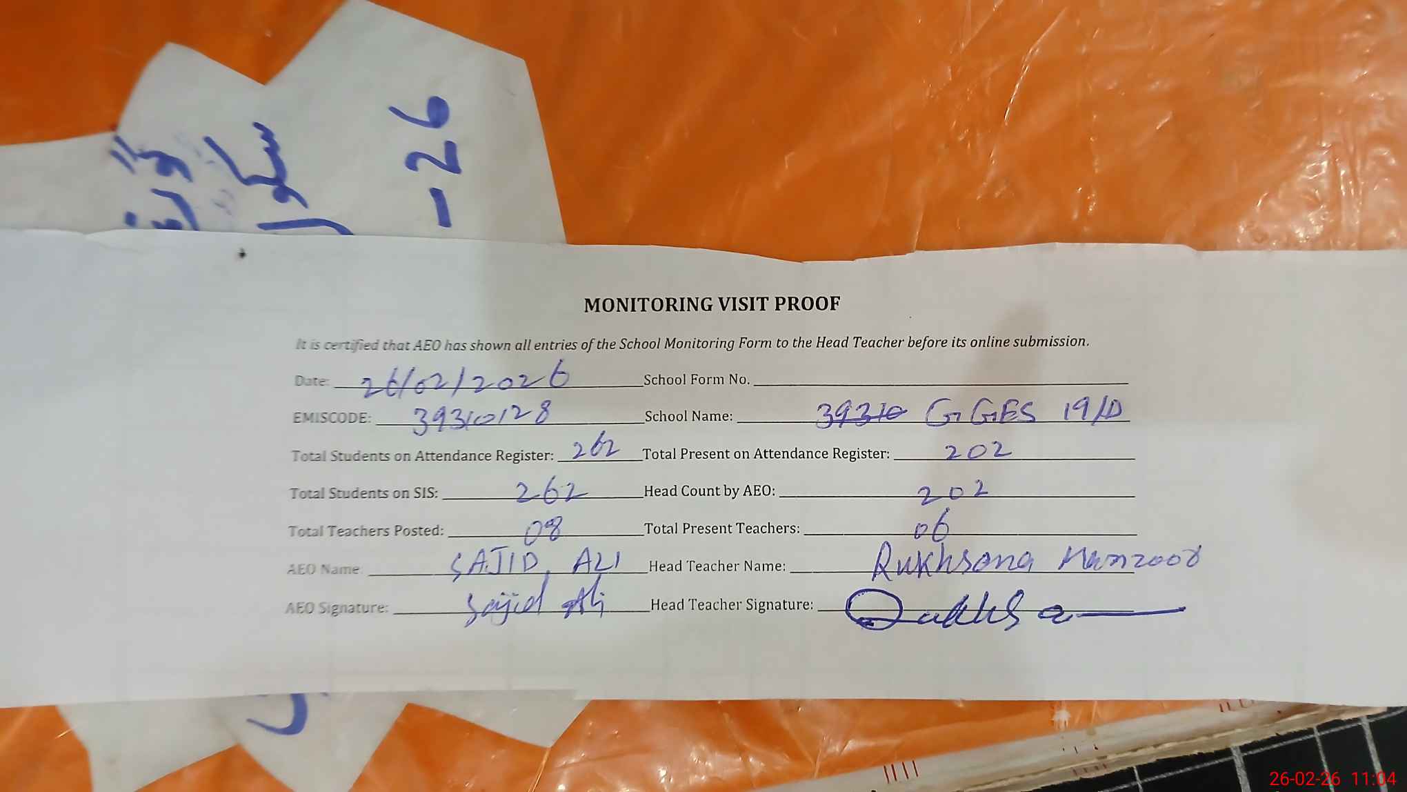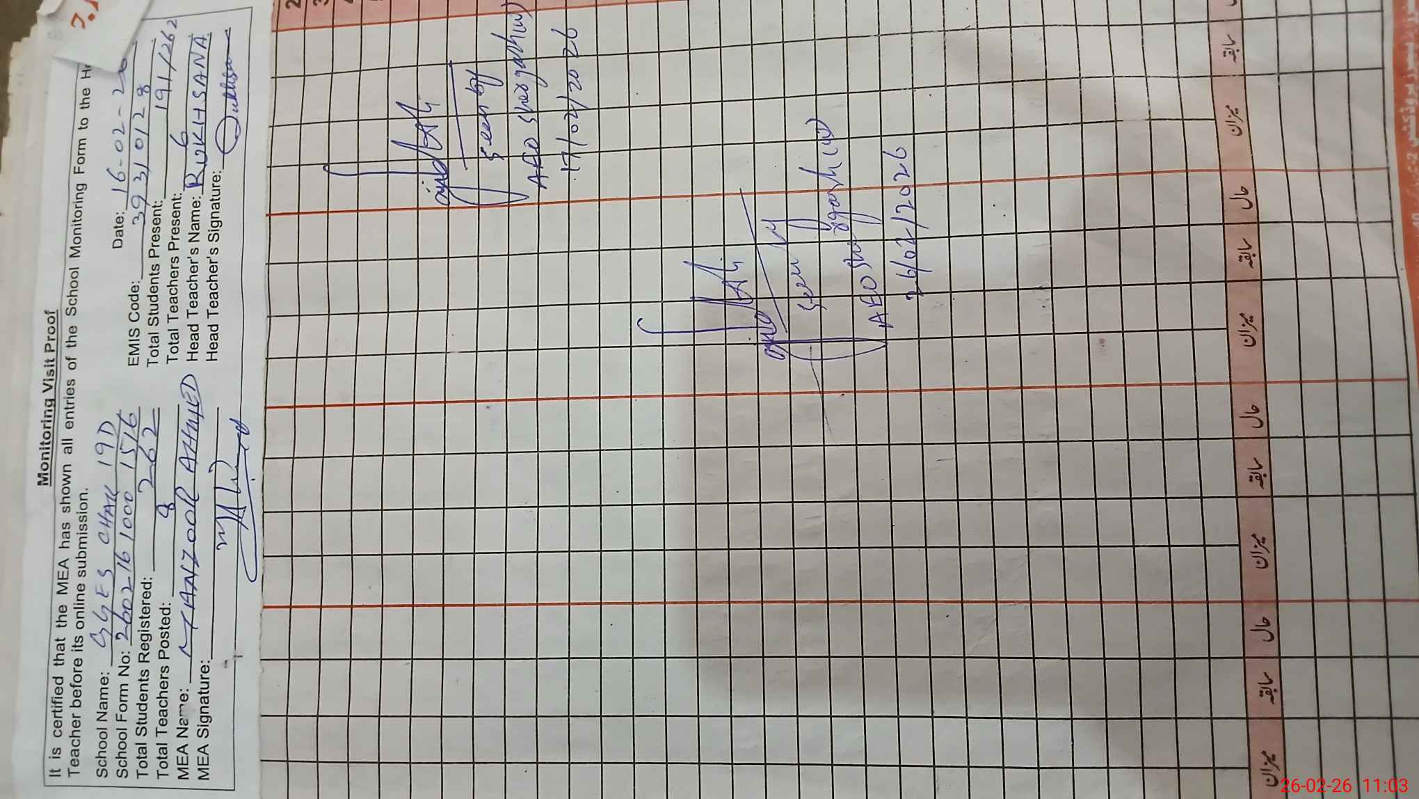 | Attendance Register | Head Teacher | MEA with School | Visit Proof |