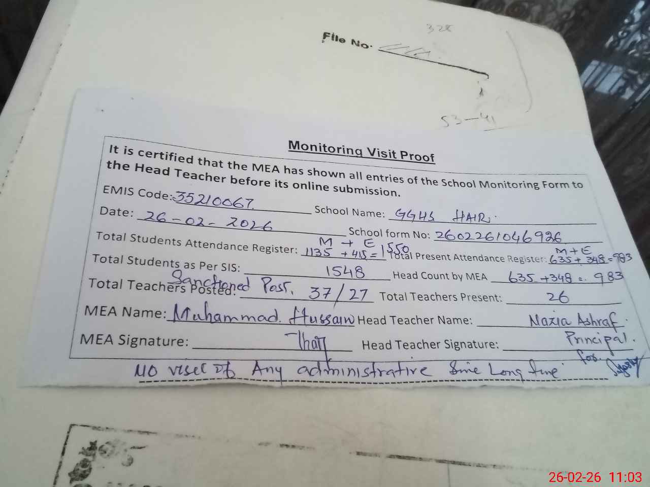 | EMIS Code: 35210067 | Name of School: GGHS HAIR LAHORE CANTT | |||