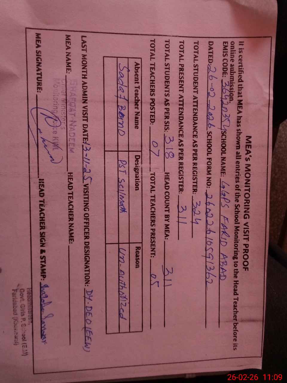 | Monitoring Date: 26-02-2026 | Start Time: 26-02-2026 10:16 AM | End Time: 26-02-2026 11:11 AM | Name of MEA: Sh**** Na**** | |