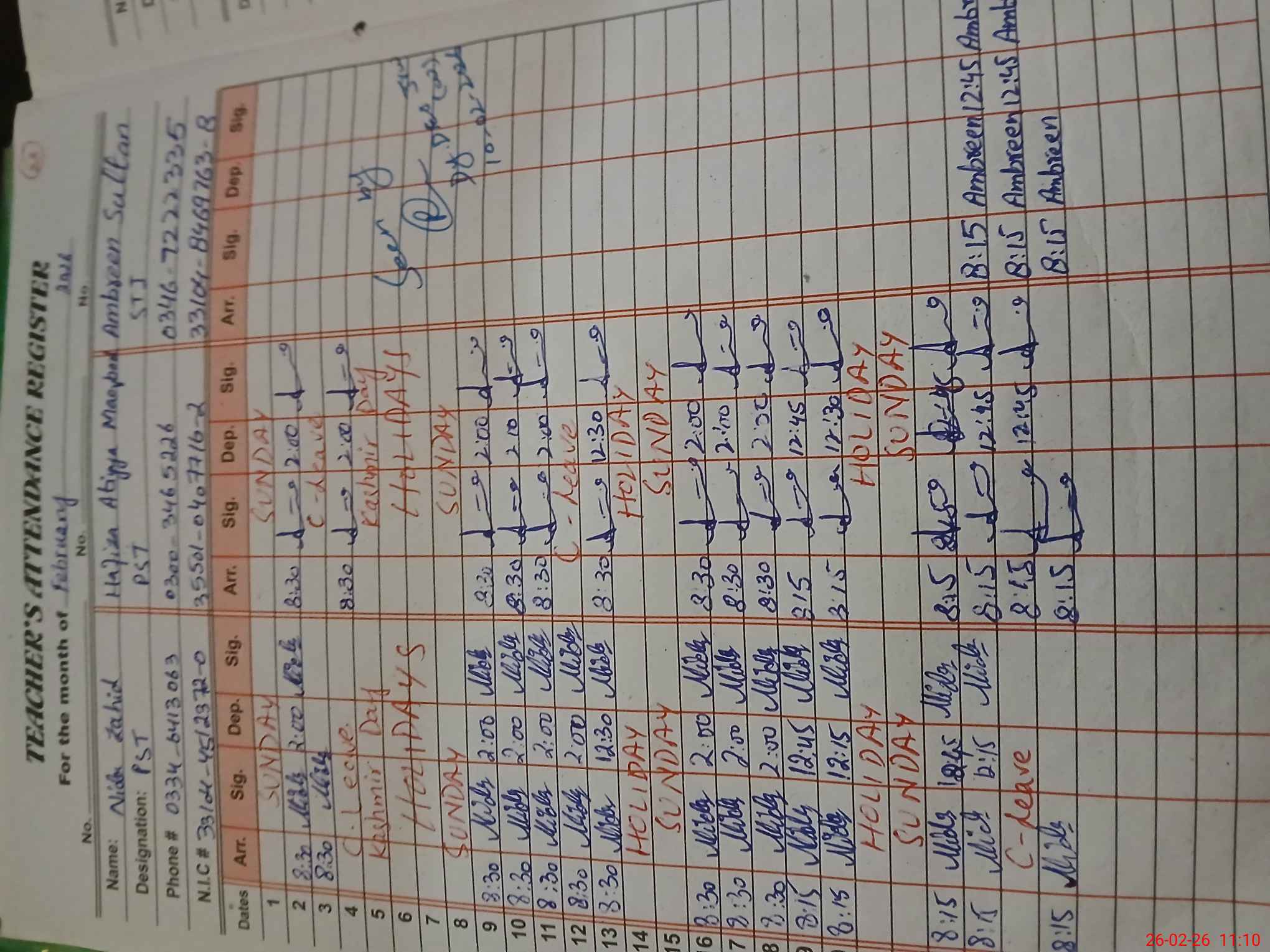| CNIC | Full Name | Designation | R/C | Absence During Last Calender Month |