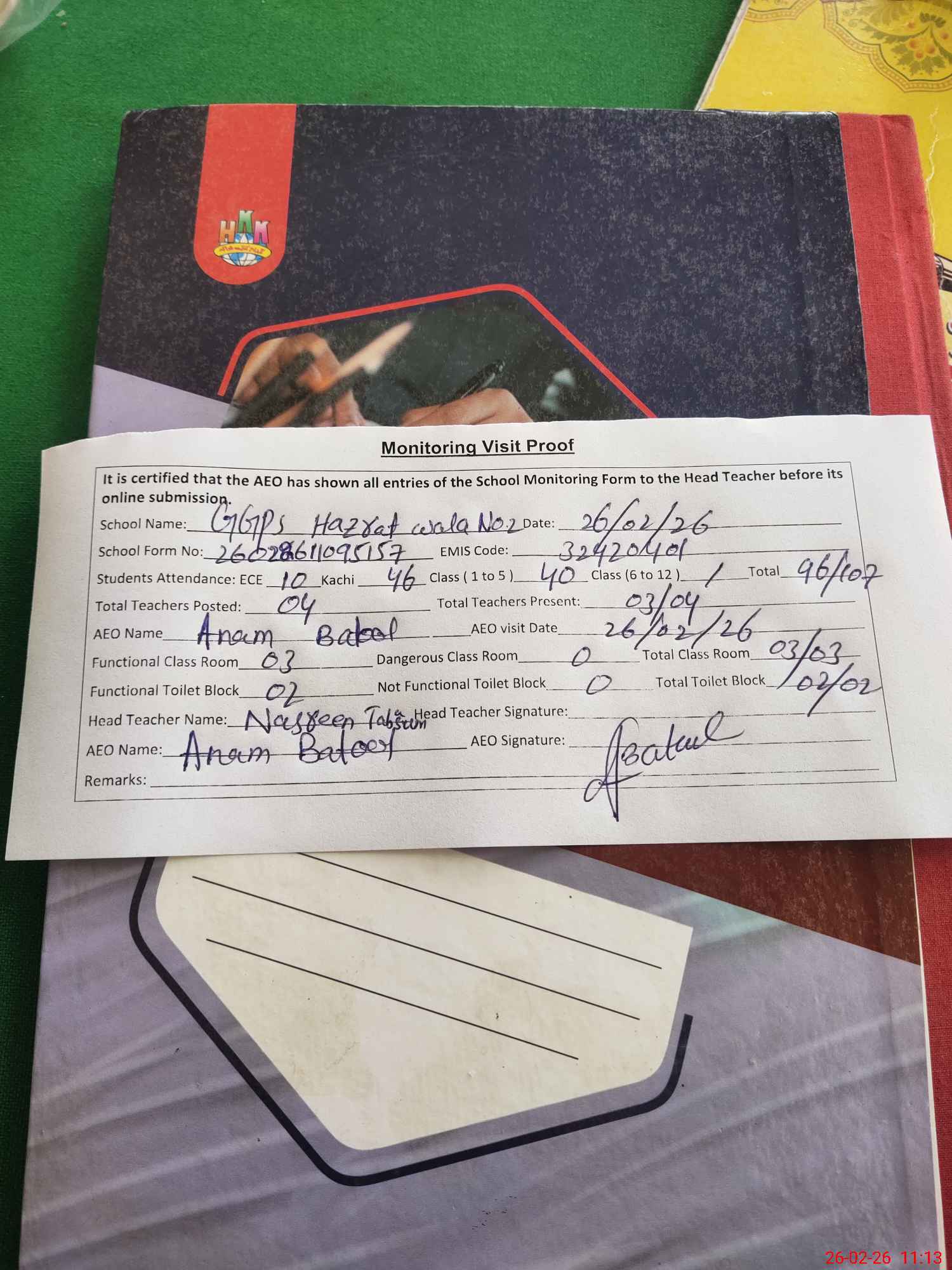 | Attendance Register | Head Teacher | MEA with School | Visit Proof |