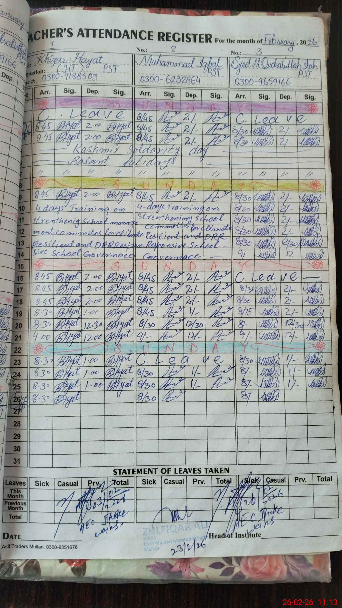 | Name: KH**** HA**** Designation: (School Headmaster's/Headmistress's) INCHARGE Phone/Cell Number: 03**** |