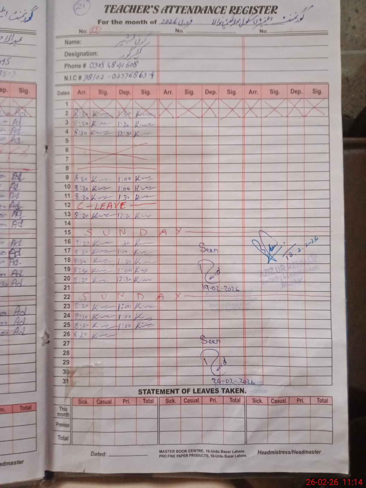 | CNIC | Full Name | Designation | R/C | Absence During Last Calender Month |