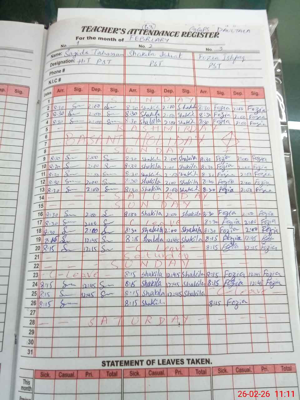 | CNIC | Full Name | Designation | R/C | Absence During Last Calender Month |