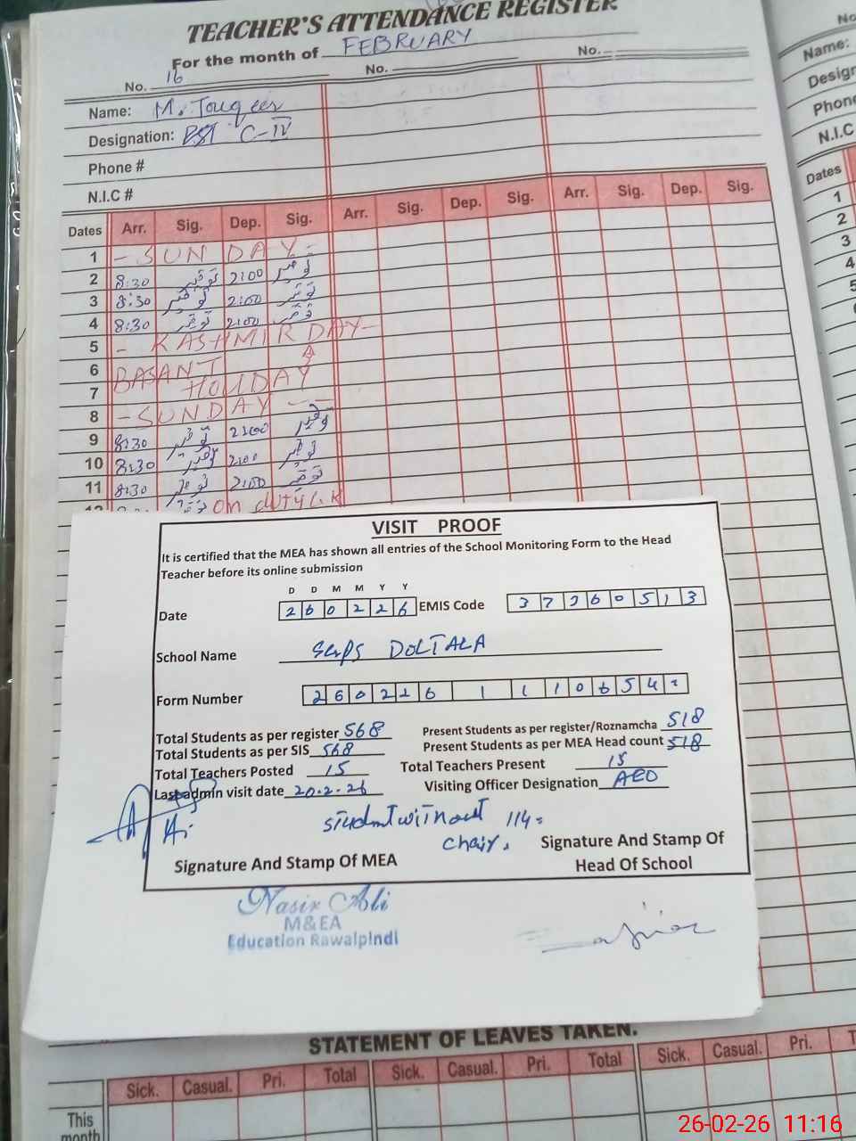 | Attendance Register | Head Teacher | MEA with School | Visit Proof |