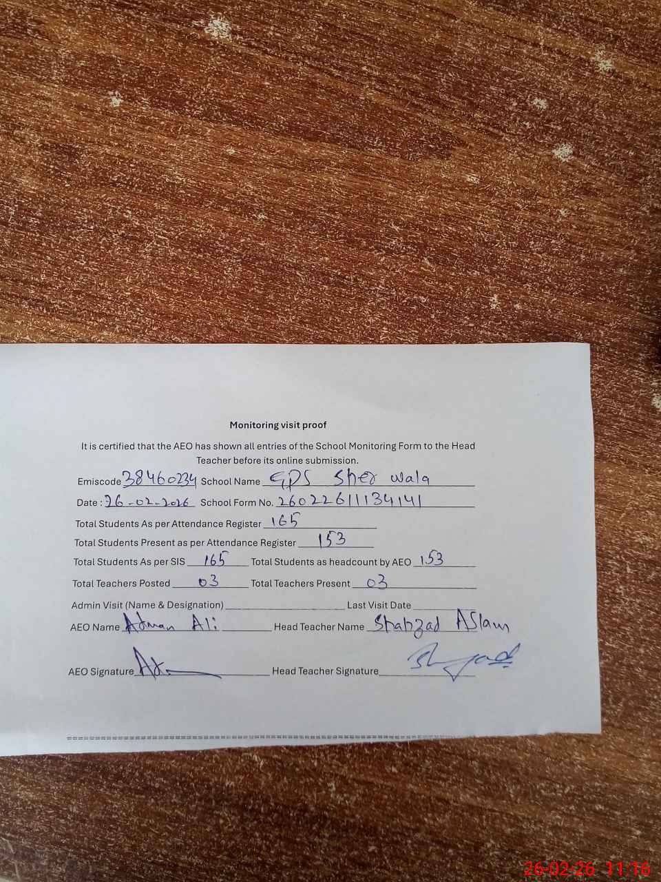 | EMIS Code: 38460234 | Name of School: GPS SHER WALA | |||