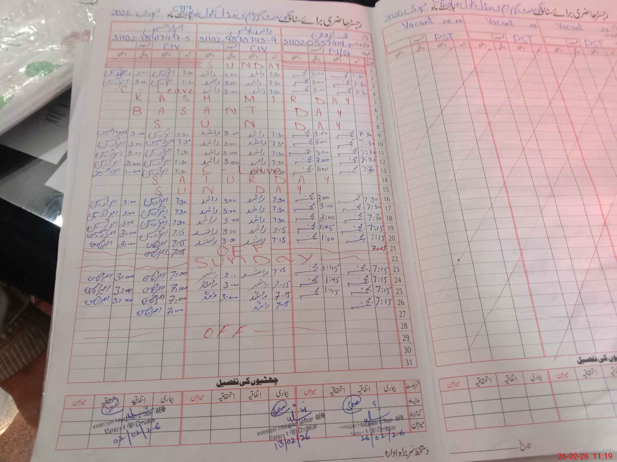 | CNIC | Full Name | Designation | R/C | Absence during last cal. month |
