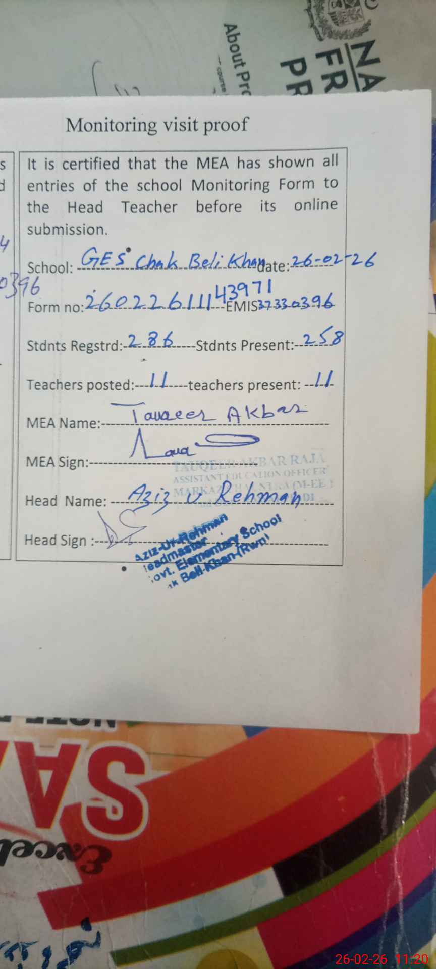 | Attendance Register | Head Teacher | MEA with School | Visit Proof |