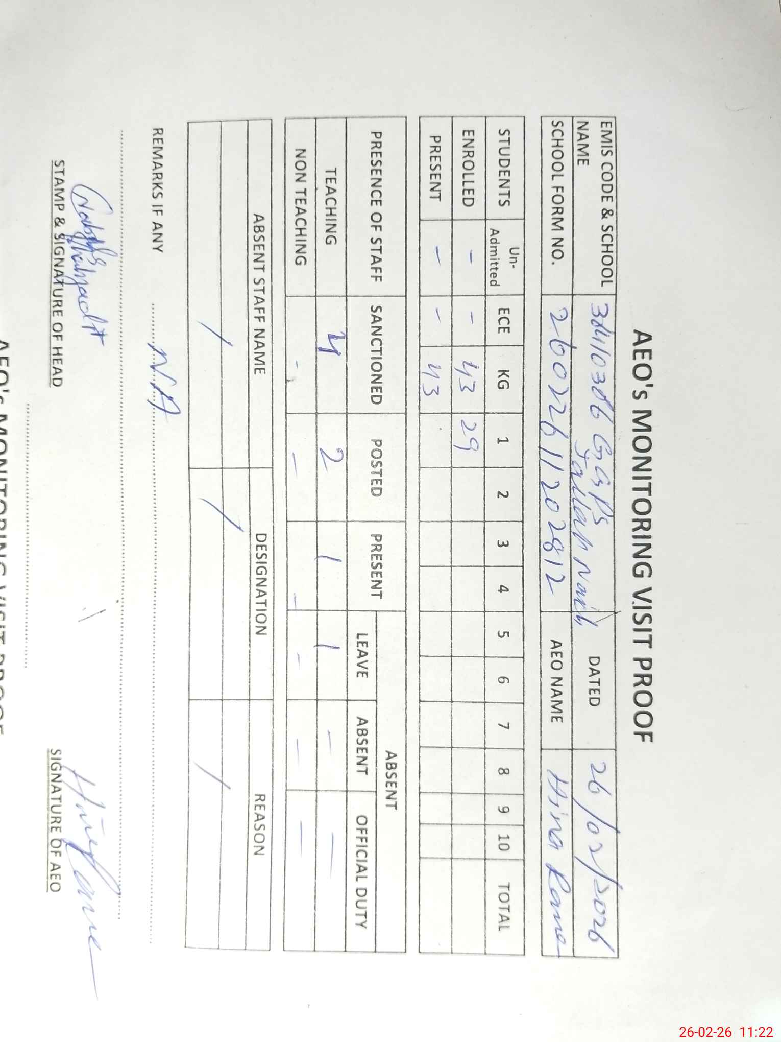 | Attendance Register | Head Teacher | MEA with School | Visit Proof |