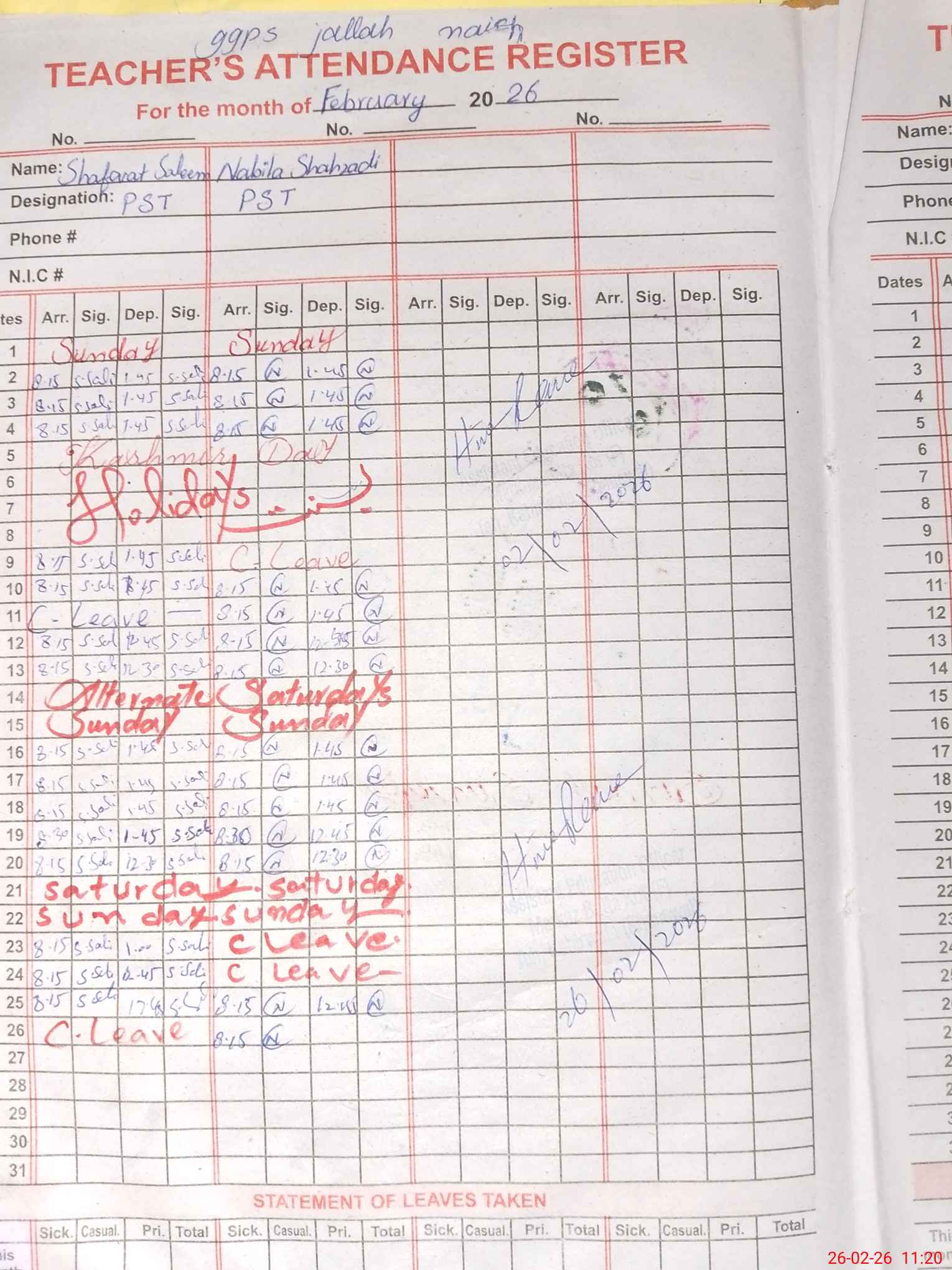 | CNIC | Full Name | Designation | R/C | Absence During Last Calender Month |