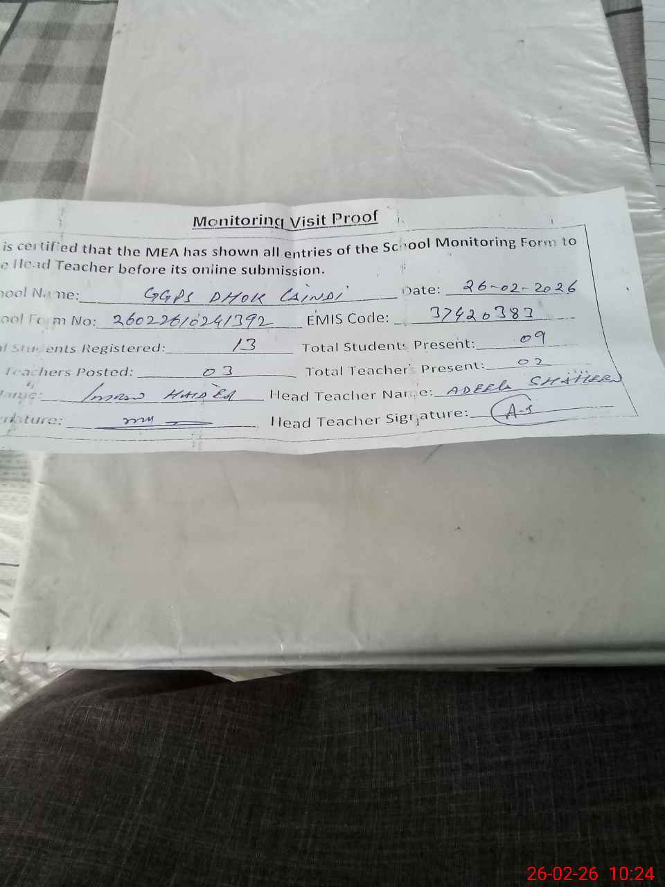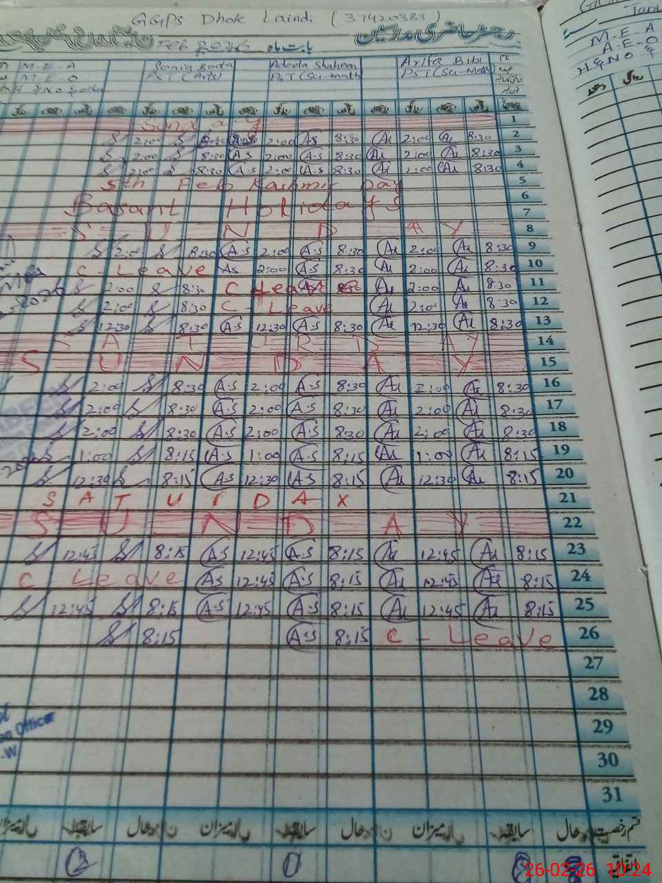 | Remarks (Use Separate Page if Required): Today during monitoring visit of said school it was noted that Head teacher was on casual leave her leave was approved by AEO in hard copy instead of HRMS. Reason was this that same teacher was on EX PAK leave wef 20 Nov 2025 to 13 Dec 2025 but her that leave is still pending on HRMS where as she is back from that leave. | |||||
