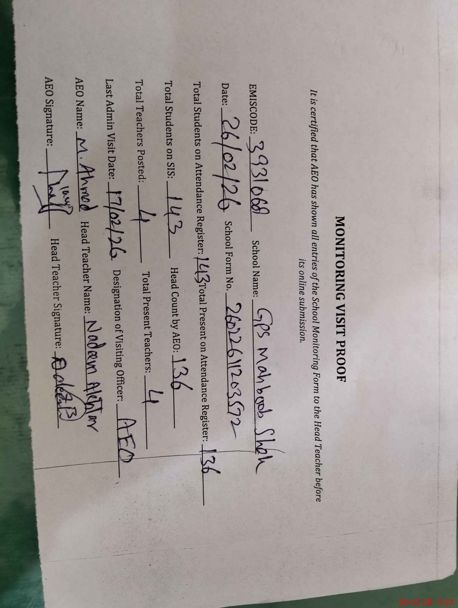 | EMIS Code: 39310609 | Name of School: GPS MAHBOOB SHAH | |||