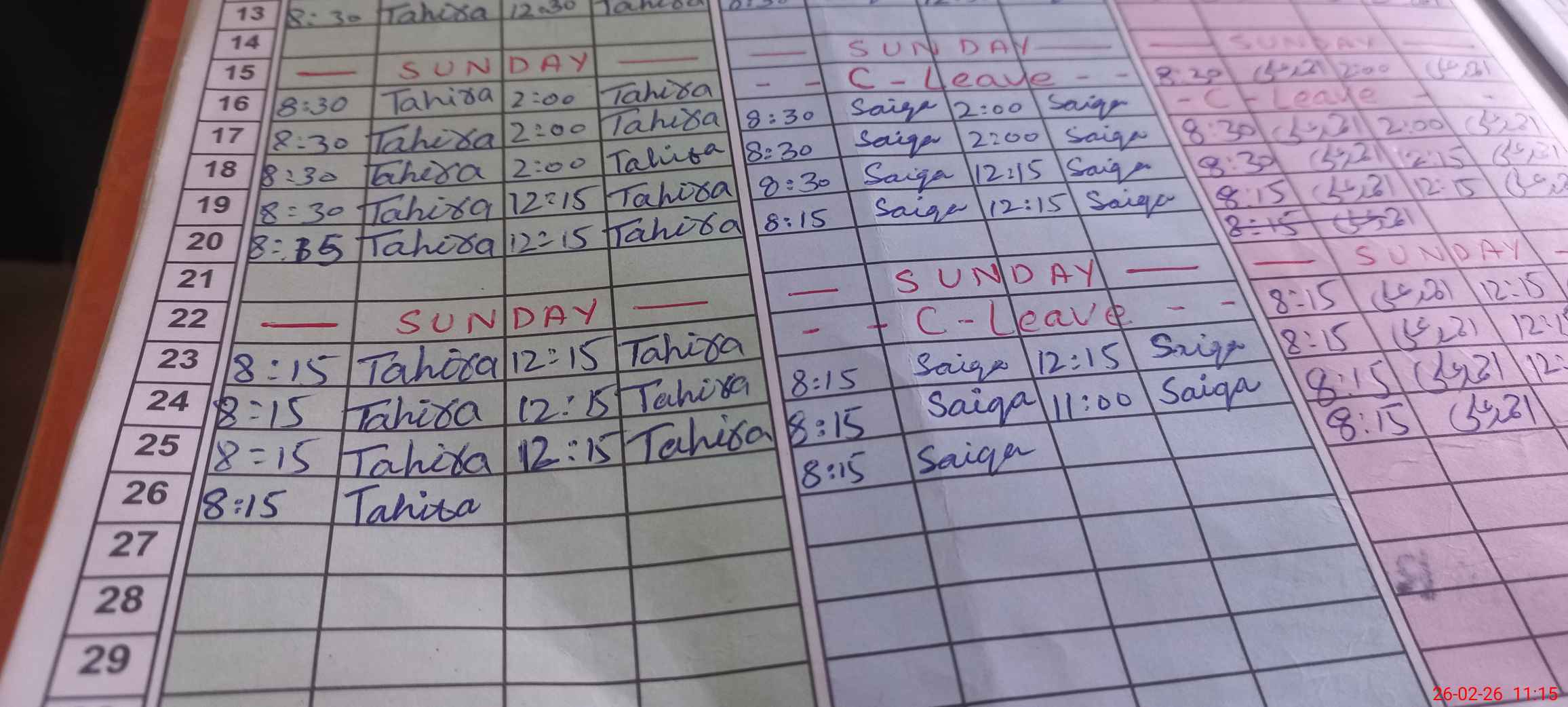 | Leave | Duty | Absent | Maternity | Medical | Ex- Pak |