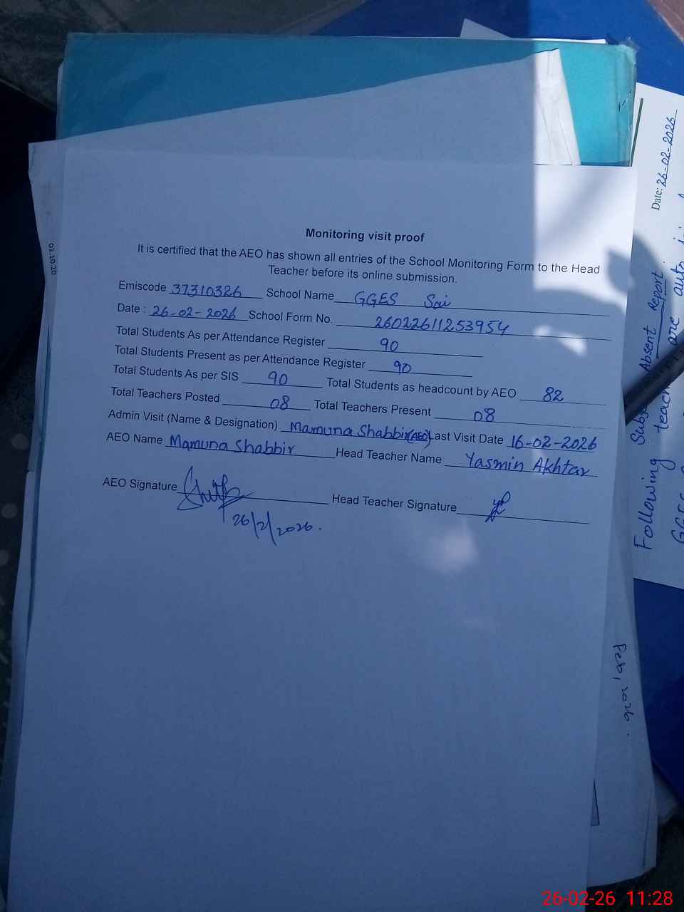 | Attendance Register | Head Teacher | MEA with School | Visit Proof |