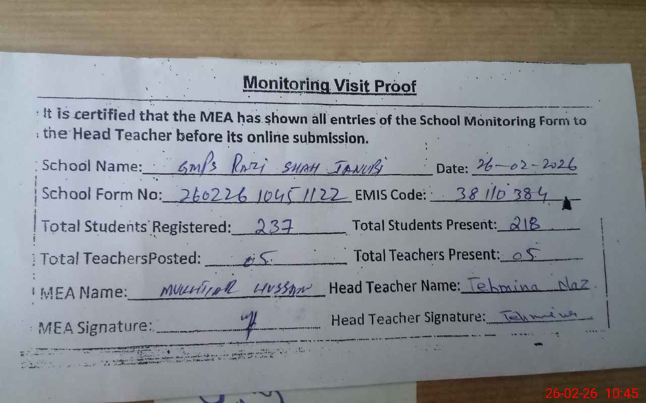 | EMIS Code: 38110384 | Name of School: GMPS RAZI SHAH JANUBI PO NOTAK | |||