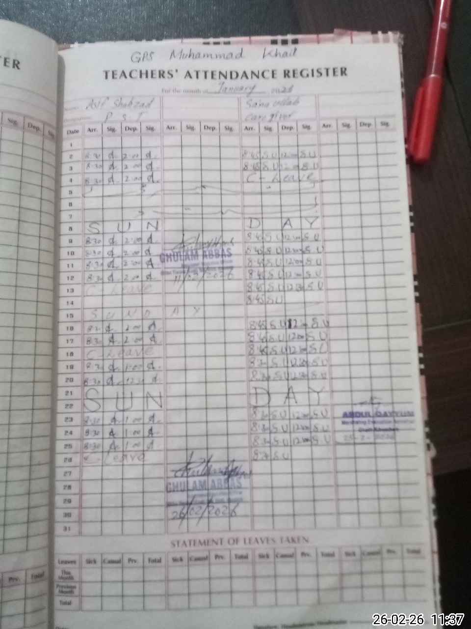 | Attendance Register | Head Teacher | MEA with School | Visit Proof |