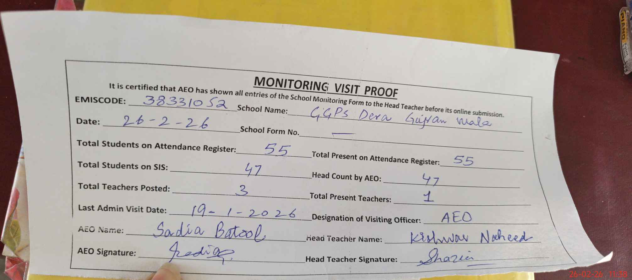| Attendance Register | Head Teacher | MEA with School | Visit Proof |