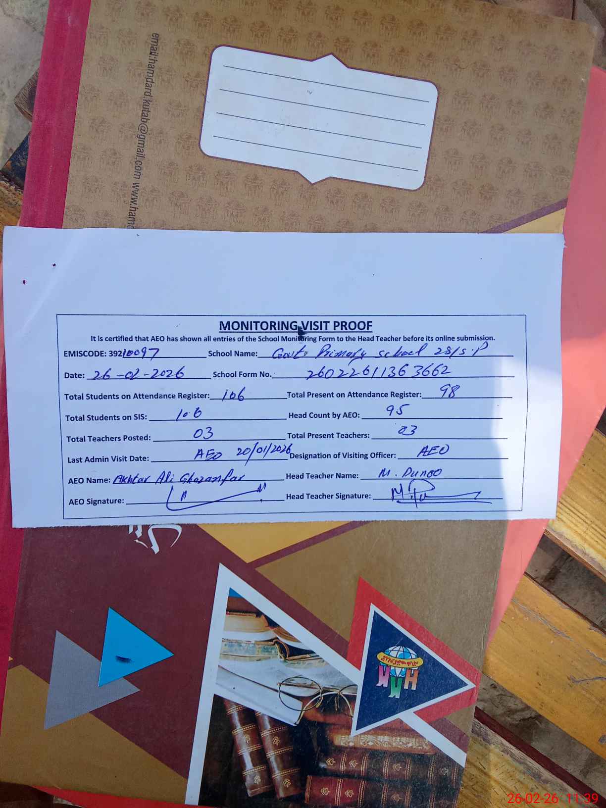| Attendance Register | Head Teacher | MEA with School | Visit Proof |