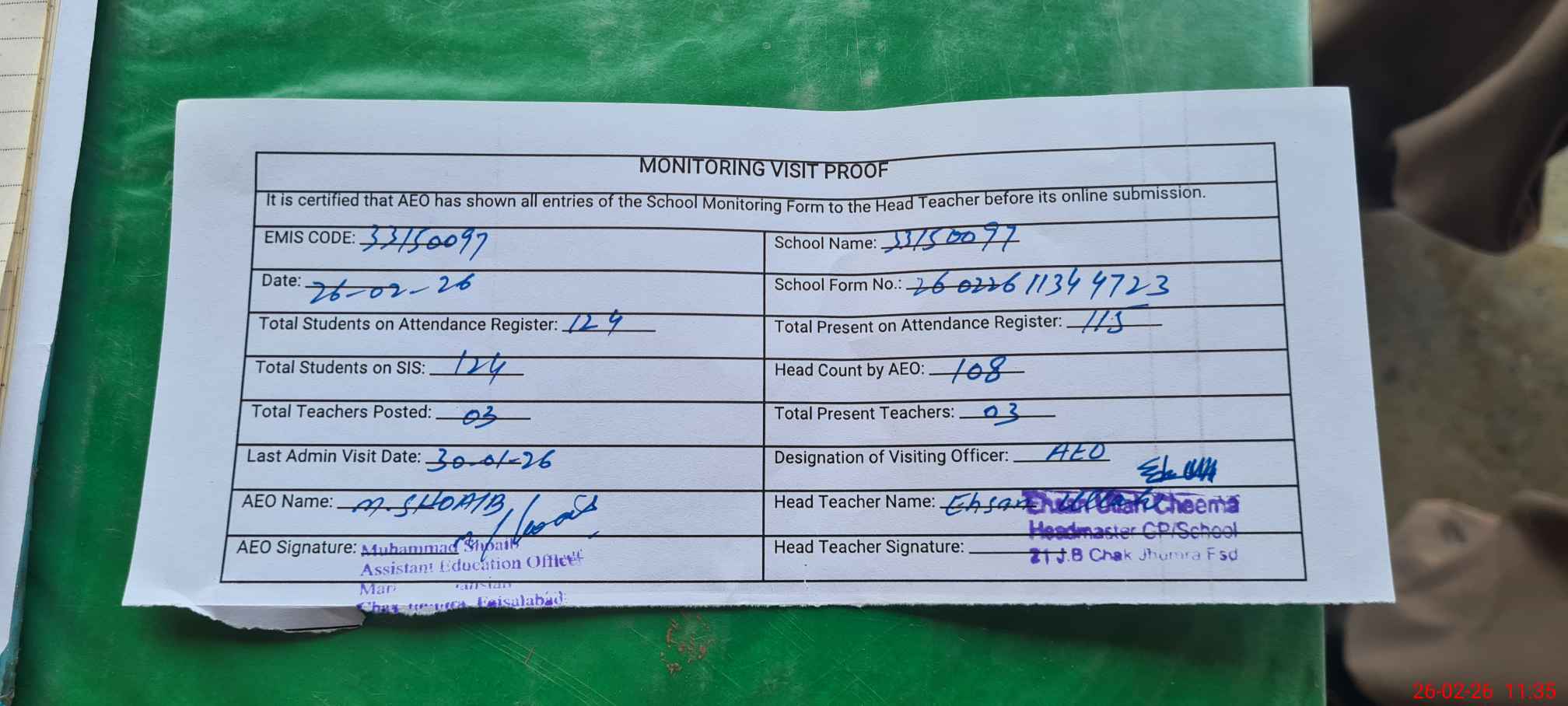| Attendance Register | Head Teacher | MEA with School | Visit Proof |