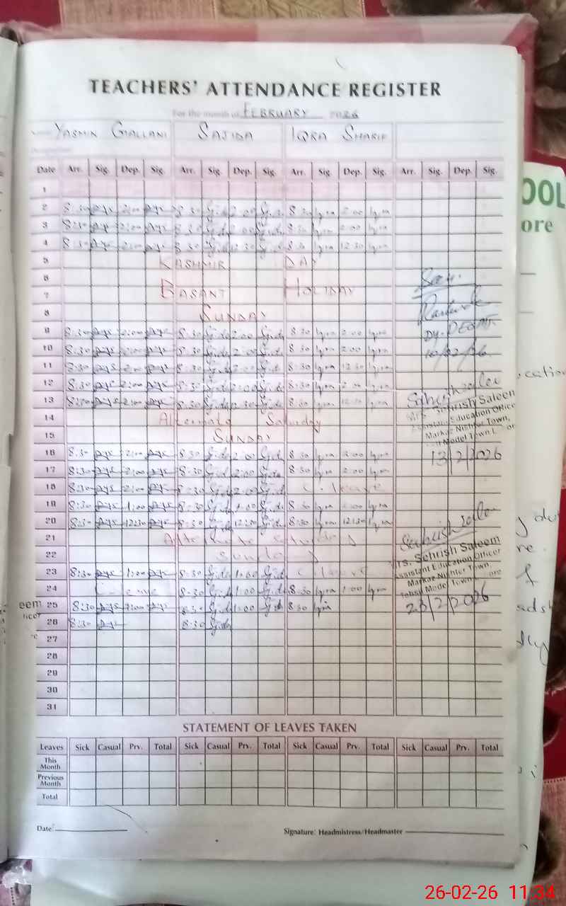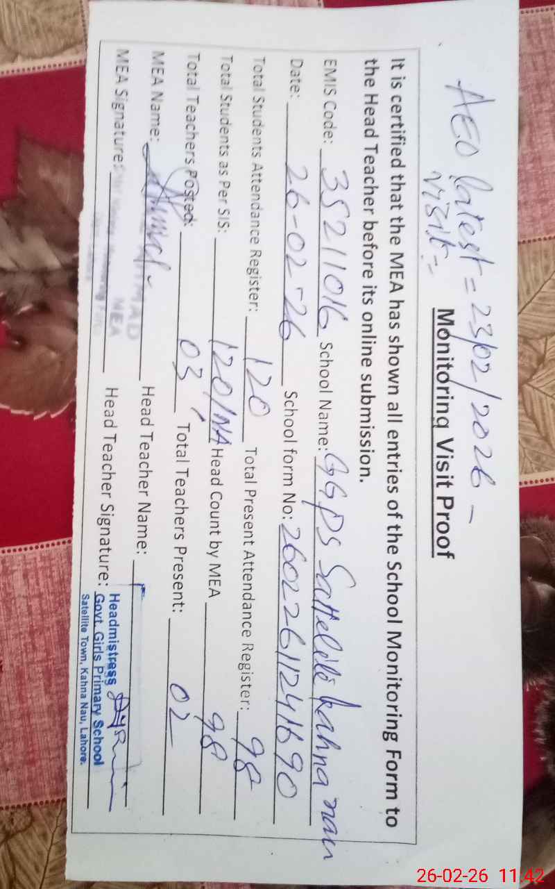 | Remarks (Use Separate Page if Required): Tab teachers list is empty but three teachers are appointed earlier it was satellite of GGES kahna nau under EMIS code 35210715, now it has allotted new EMIS code, 35211016 in PMIU. According to the letter available in the school EMIS is 35211010 Teachers Yasmeen gilani pst , Sajida Sharif and Iqra are performing duties here . Out of 03 three teachers 02 are present today Teacher Iqra attendance colomn is blank more over no proof in hard or soft copy of casual leave. out 120 students 98 are present today | |||||