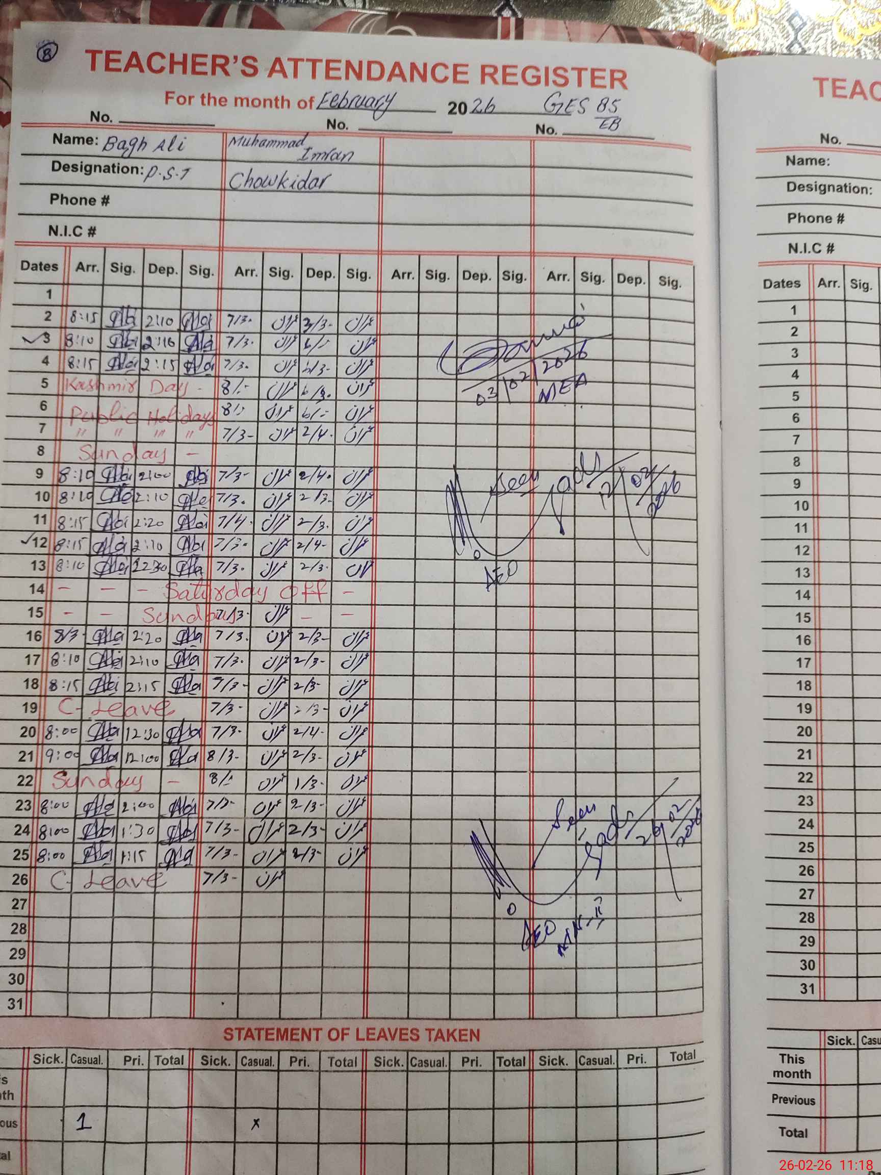 | Monitoring Date: 26-02-2026 | Start Time: 26-02-2026 11:16 AM | End Time: 26-02-2026 11:43 AM | Name of MEA: Ab**** Qa**** kh**** Az**** | |