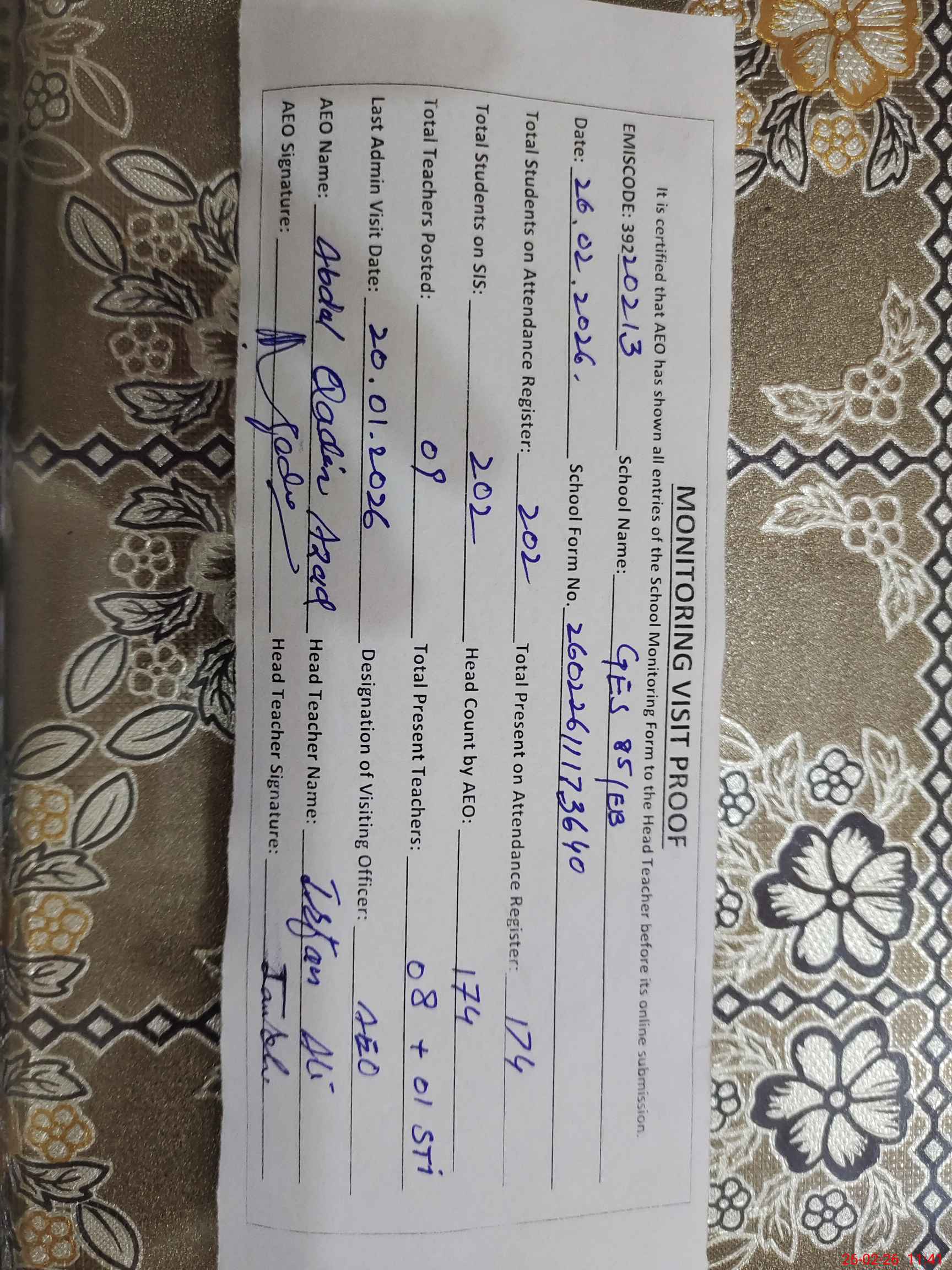 | Certified that this School was Inspected by the Undersigned MEA/DMO Today and the Information Stated Above is as Per Record. | |||||