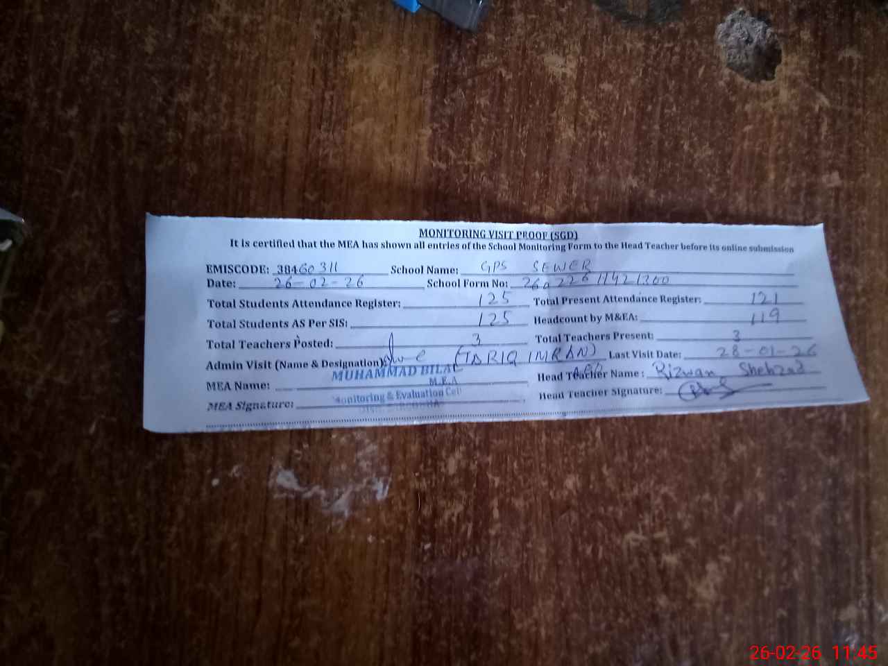 | Attendance Register | Head Teacher | MEA with School | Visit Proof |