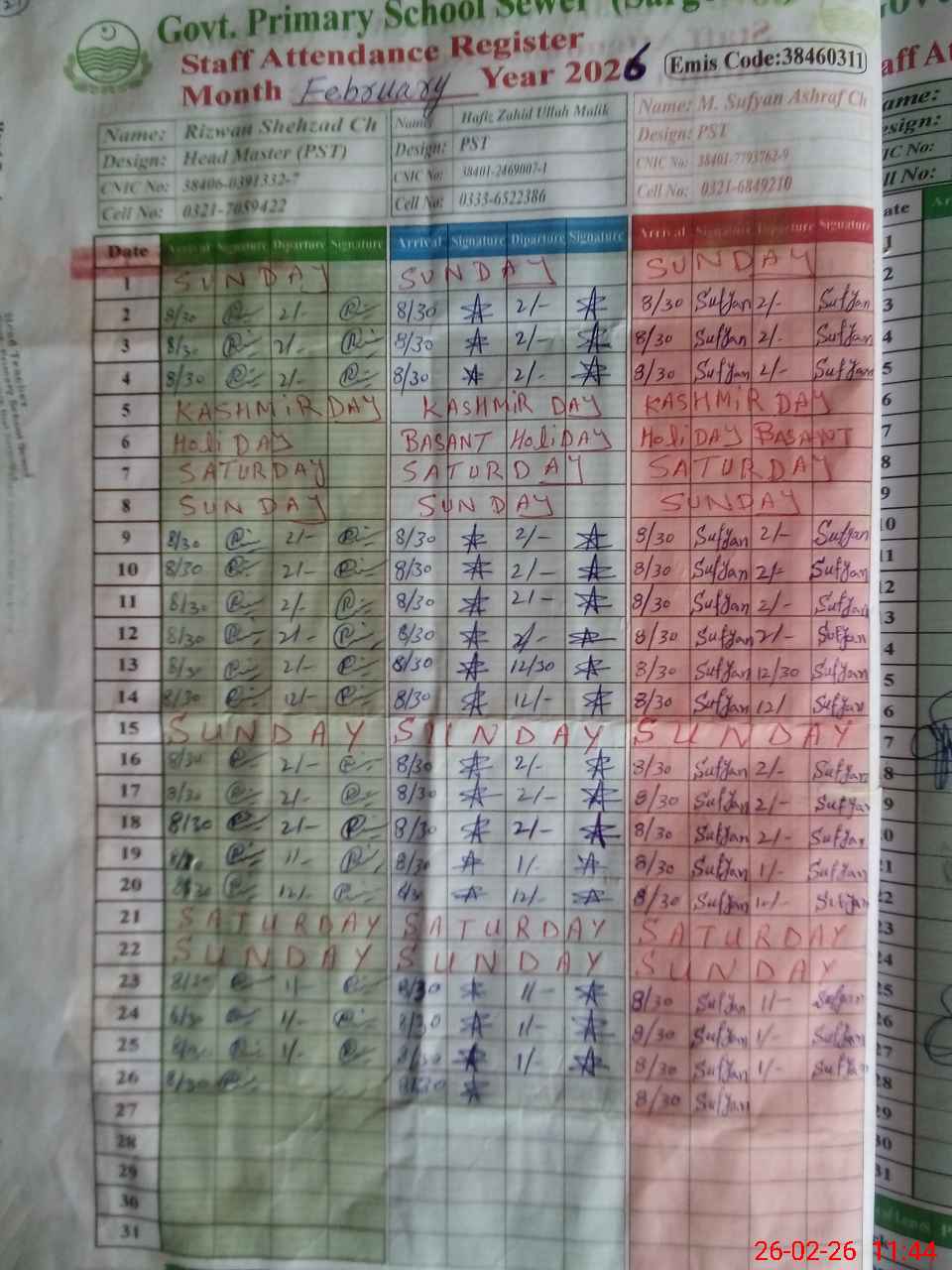 | Name: RI**** SH**** Designation: (School Headmaster's/Headmistress's) PST Phone/Cell Number: 03**** |