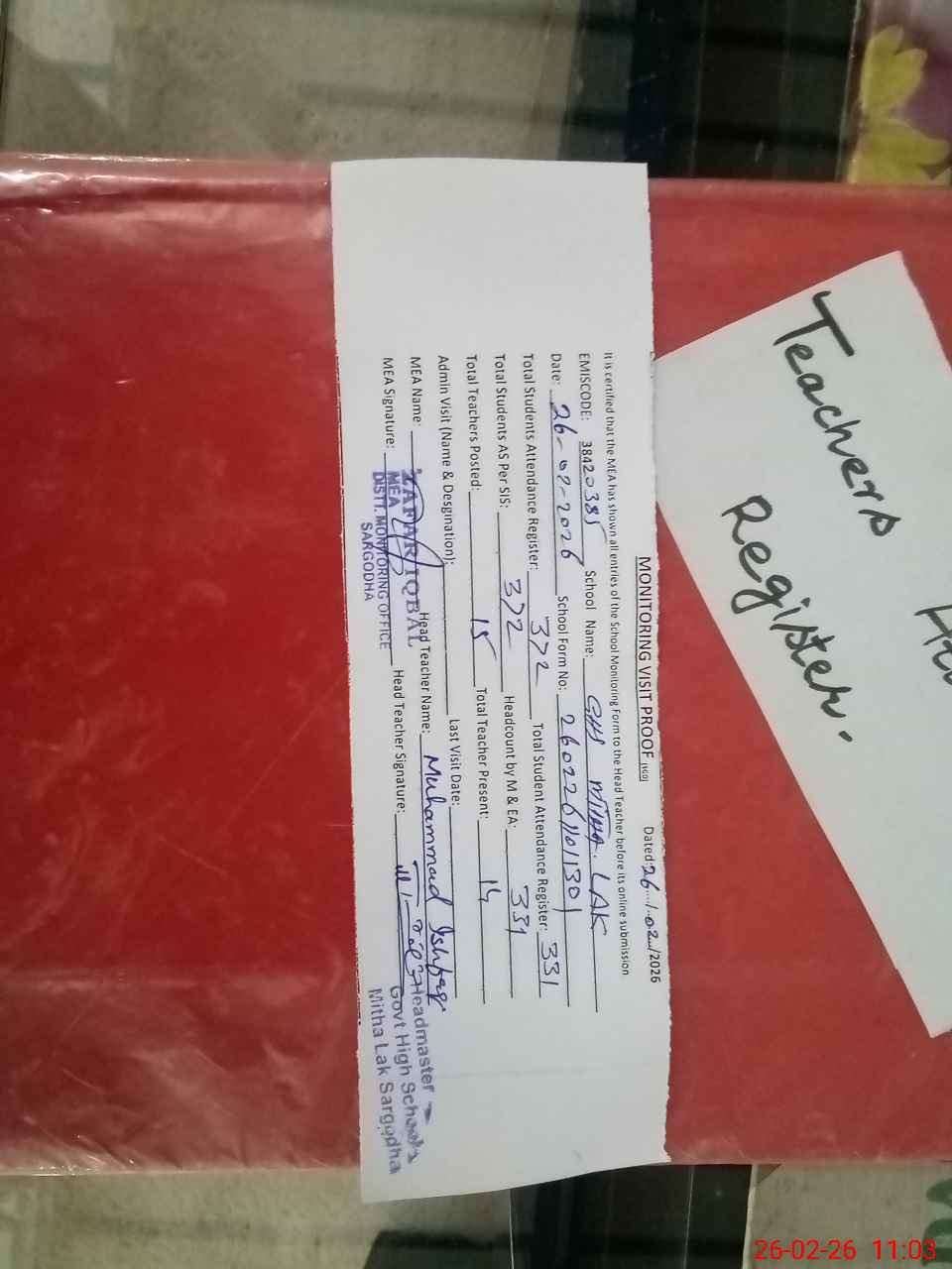| Attendance Register | Head Teacher | MEA with School | Visit Proof |