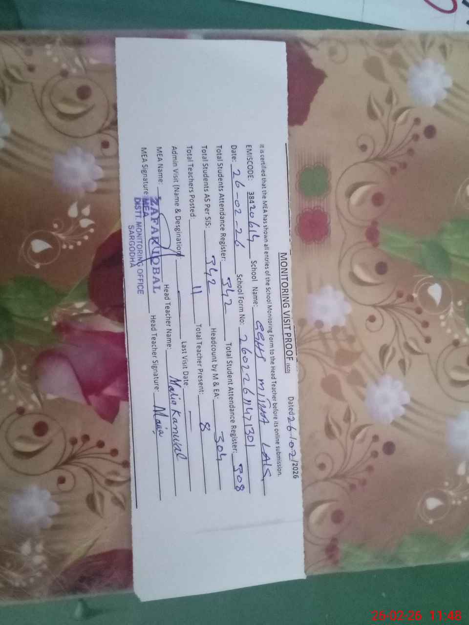 | Attendance Register | Head Teacher | MEA with School | Visit Proof |