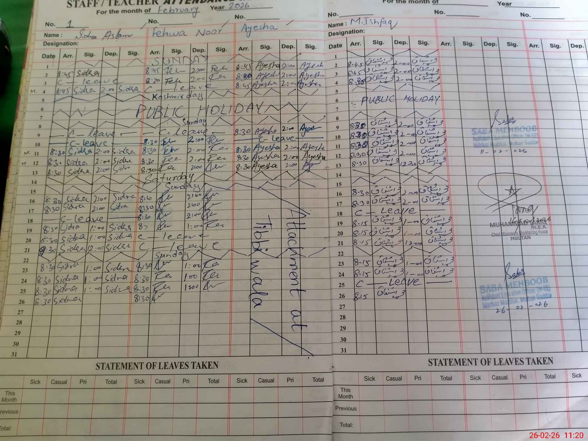 | Monitoring Date: 26-02-2026 | Start Time: 26-02-2026 11:09 AM | End Time: 26-02-2026 11:20 AM | Name of MEA: Sa**** Me**** | |