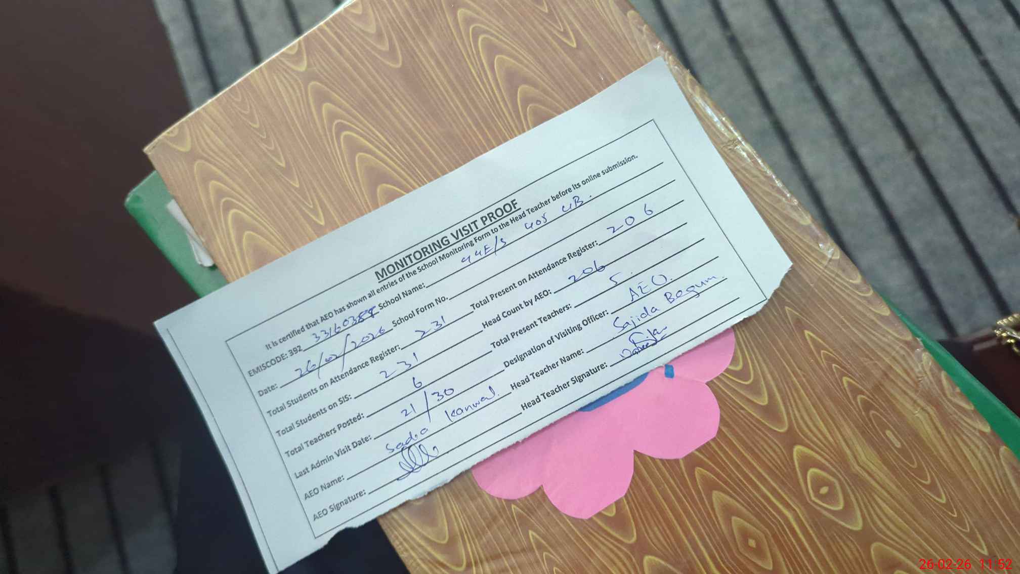 | Attendance Register | Head Teacher | MEA with School | Visit Proof |