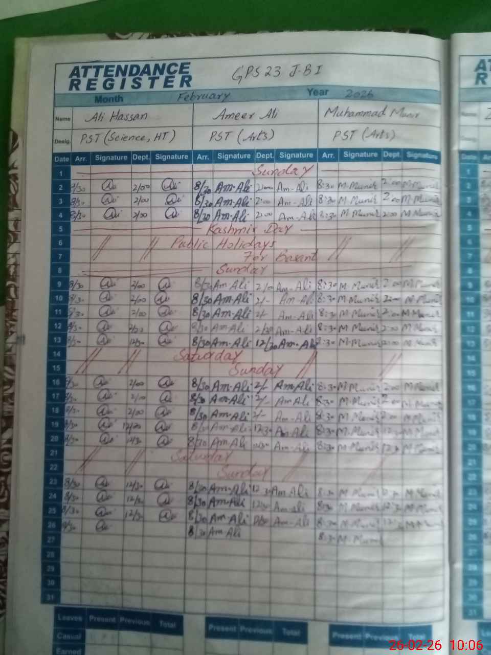 | Monitoring Date: 26-02-2026 | Start Time: 26-02-2026 09:25 AM | End Time: 26-02-2026 10:09 AM | Name of MEA: MU**** SH**** MU**** | |