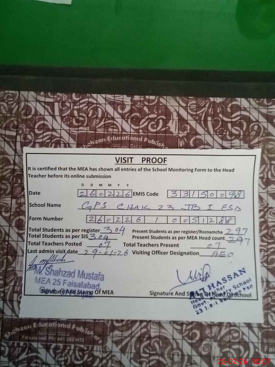 | Attendance Register | Head Teacher | MEA with School | Visit Proof |