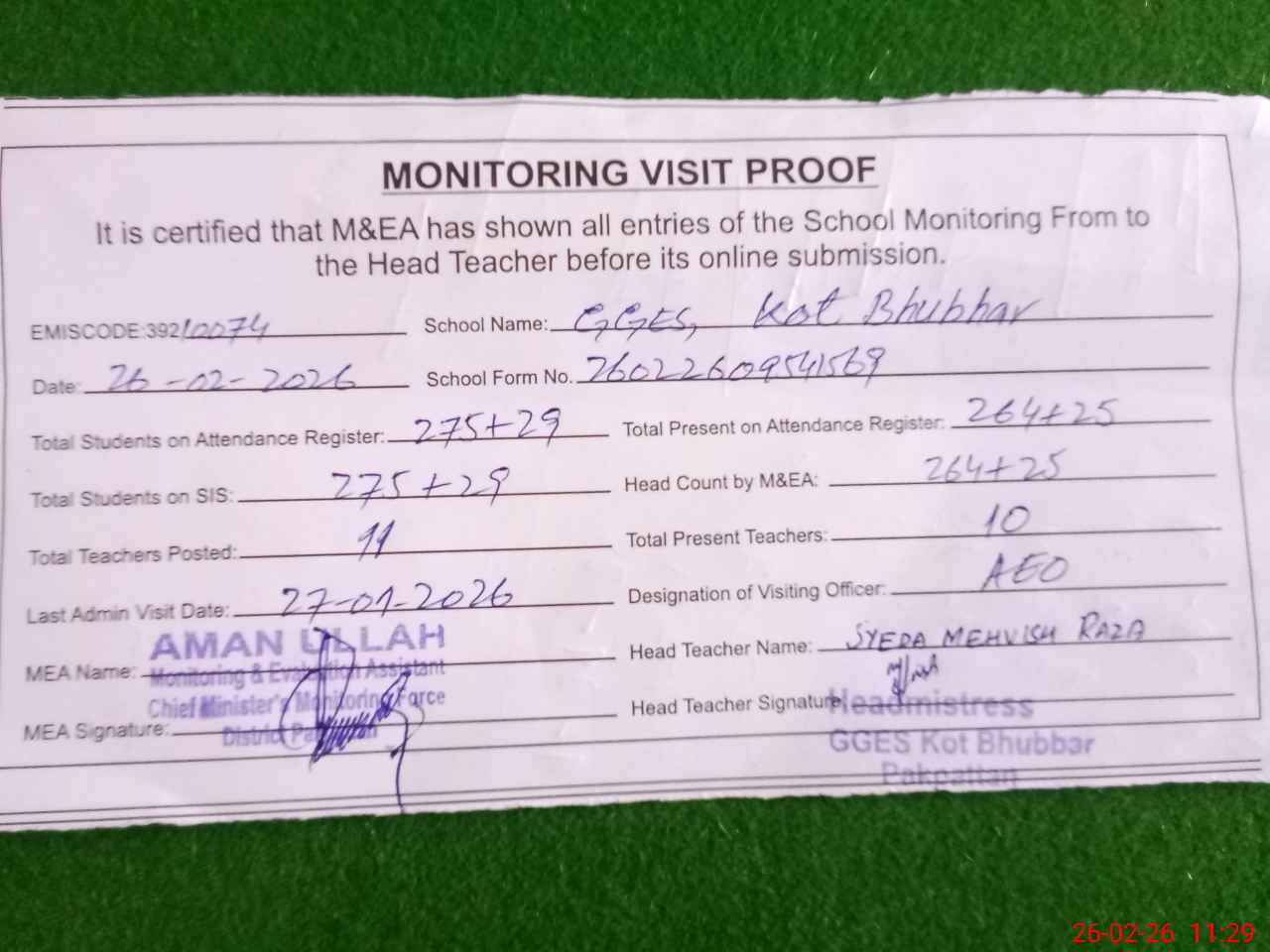 | EMIS Code: 39210074 | Name of School: GGES KOT BHUBHAR | |||