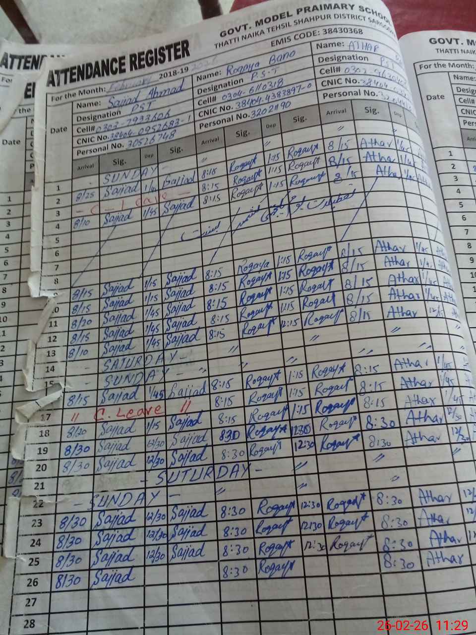 | Name: SA**** AH**** Designation: (School Headmaster's/Headmistress's) PST Phone/Cell Number: 03**** |