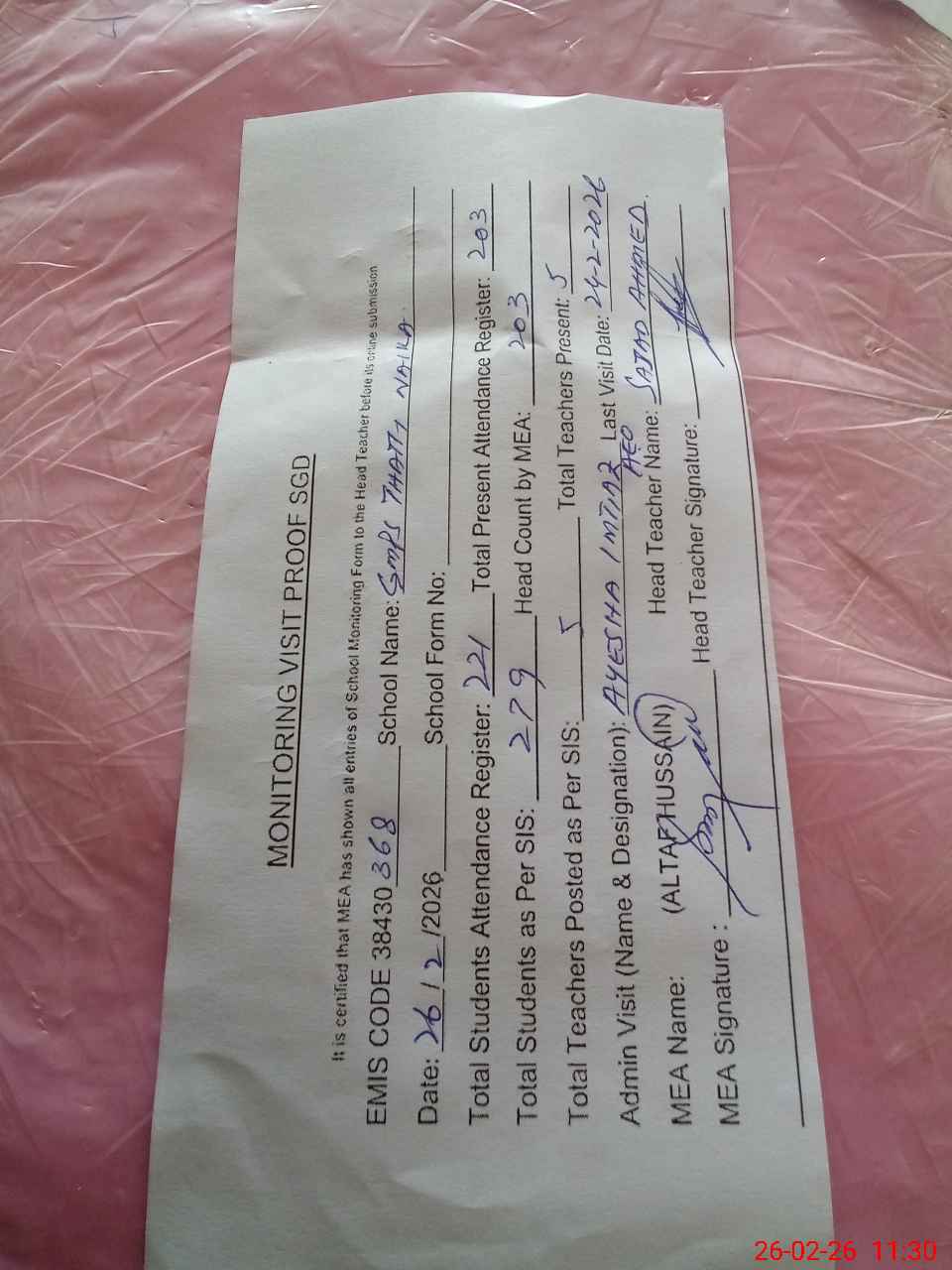 | Attendance Register | Head Teacher | MEA with School | Visit Proof |