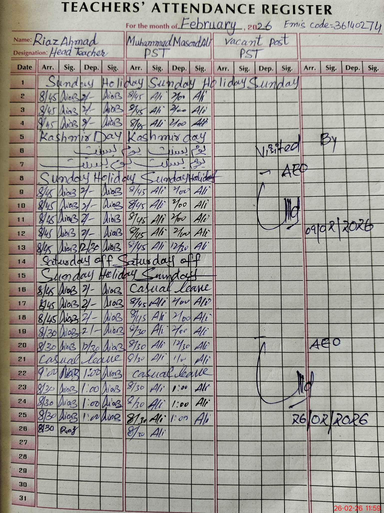 | Name: RI**** AH**** Designation: (School Headmaster's/Headmistress's) PST/PTC/JV Phone/Cell Number: 03**** |