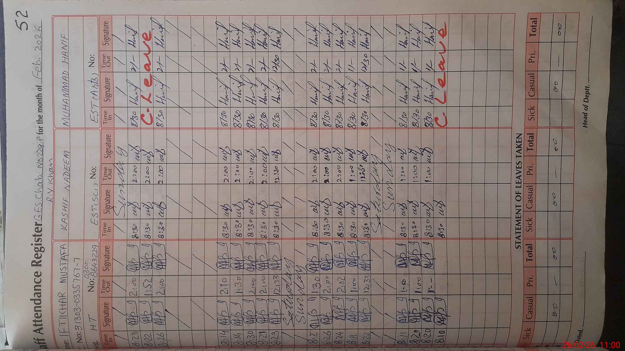 | CNIC | Full Name | Designation | R/C | Absence During Last Calender Month |
