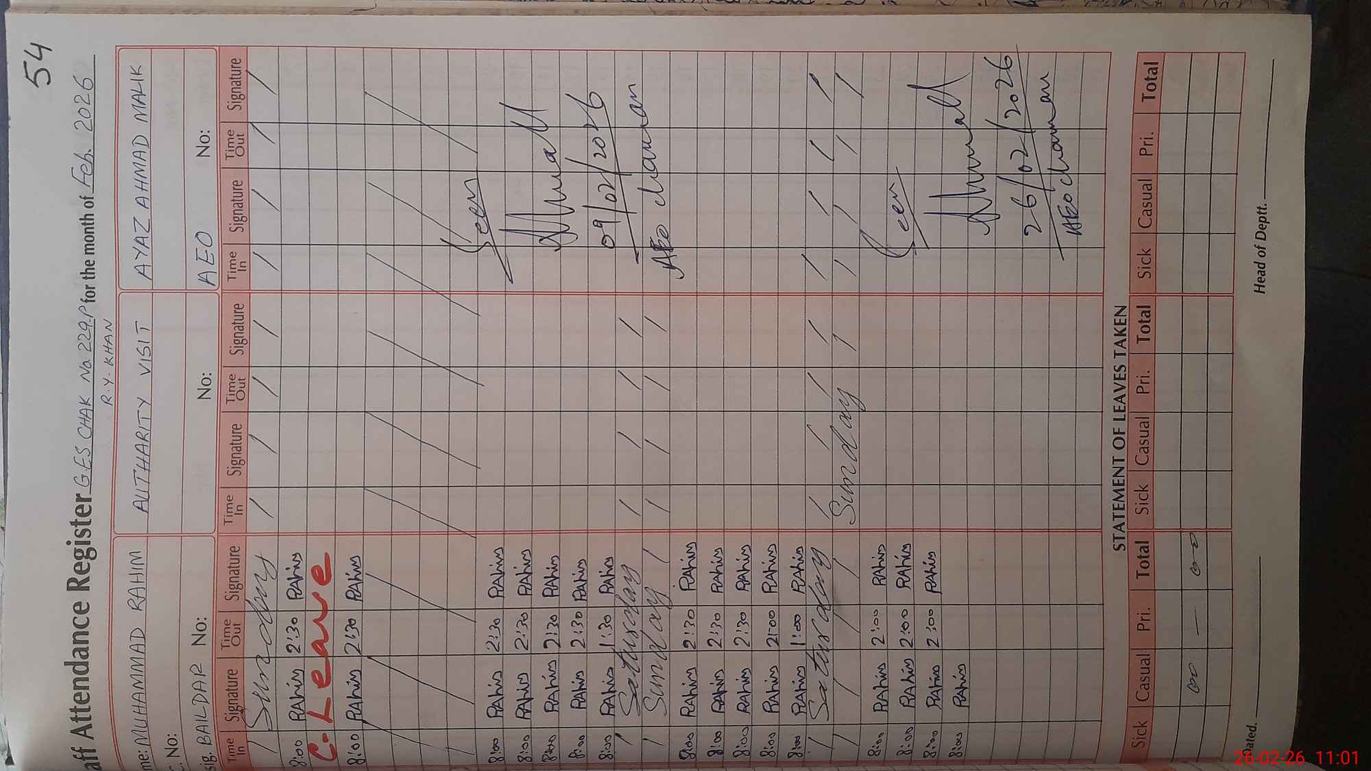 | Leave | Duty | Absent | Maternity | Medical | Ex- Pak |