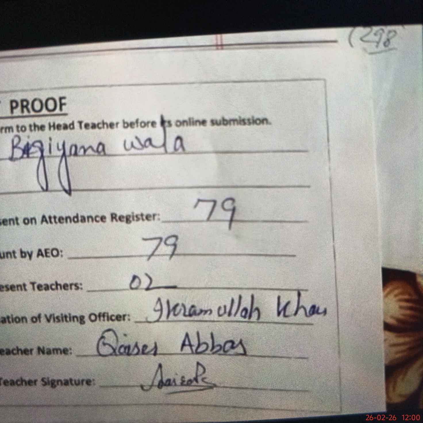 | Name: Qa**** Ab**** Designation: (School Headmaster's/Headmistress's) PST Phone/Cell Number: 03**** |