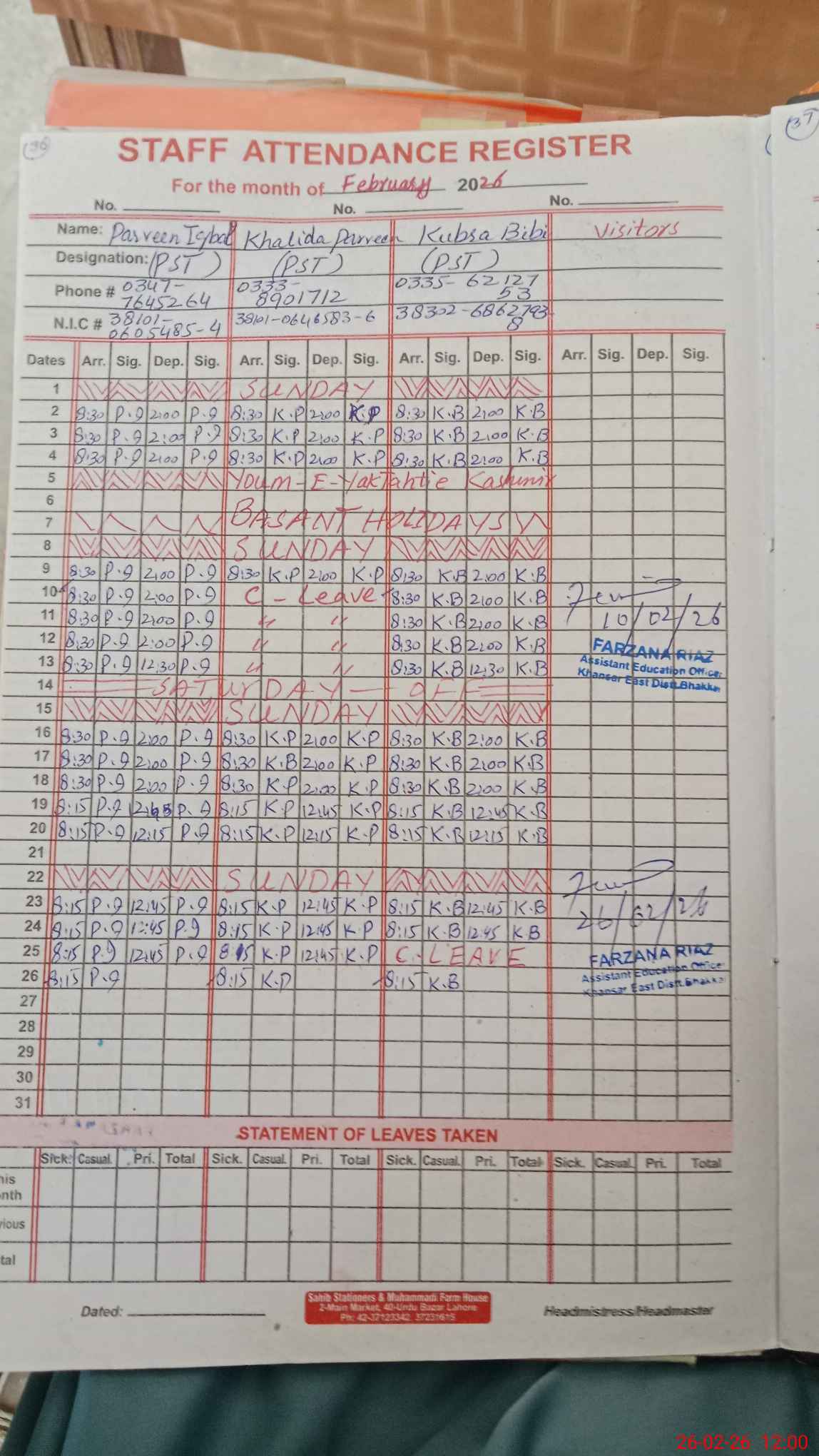 | CNIC | Full Name | Designation | R/C | Absence During Last Calender Month |